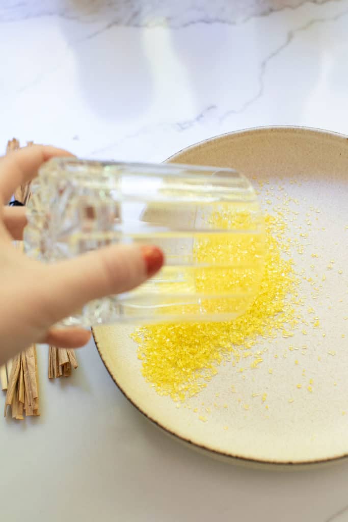 - Rim it with yellow sprinkles to add a little more charm to the glass! Wet the outer edge and rim of the glass with water and then dip it into a plate of sprinkles. Roll it around until the entire rim is coated.