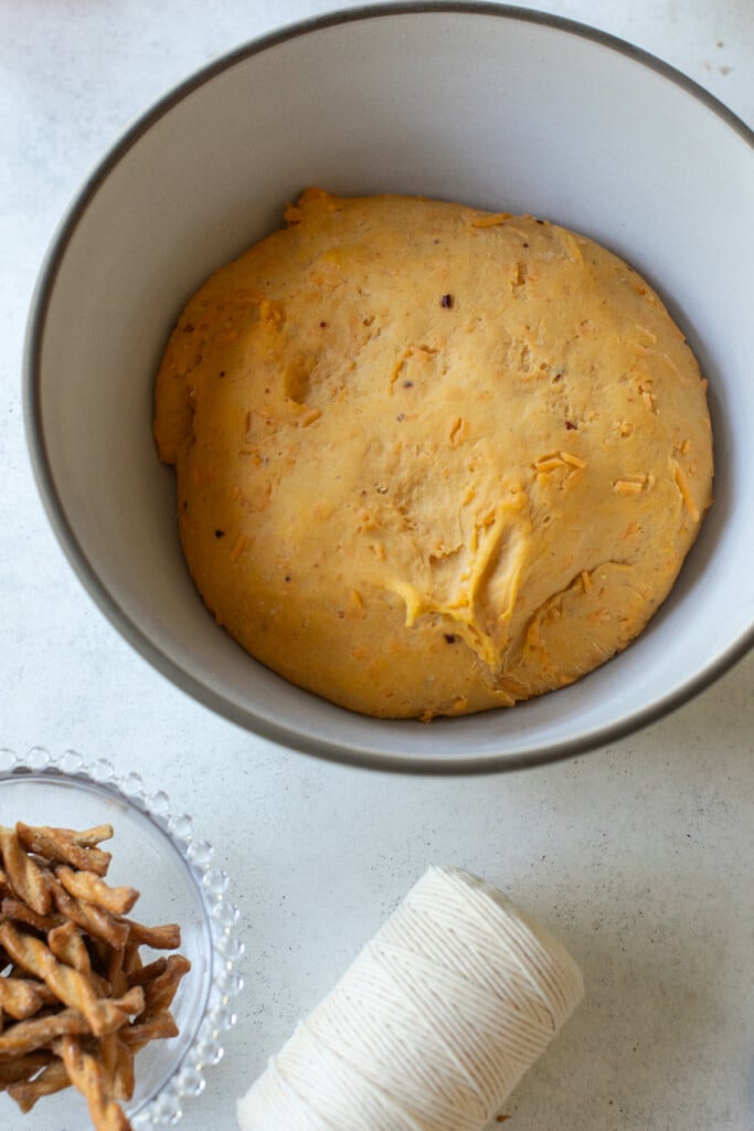 Shape the rolls: Punch down the dough and divide into 12 equal pieces. Roll each into a ball, then tie with four pieces of baker’s twine to create pumpkin segments. Arrange on a parchment-lined baking sheet.
