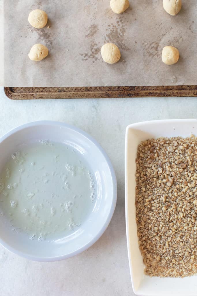 Roll: Scoop dough into balls, roll in egg whites, then walnuts.